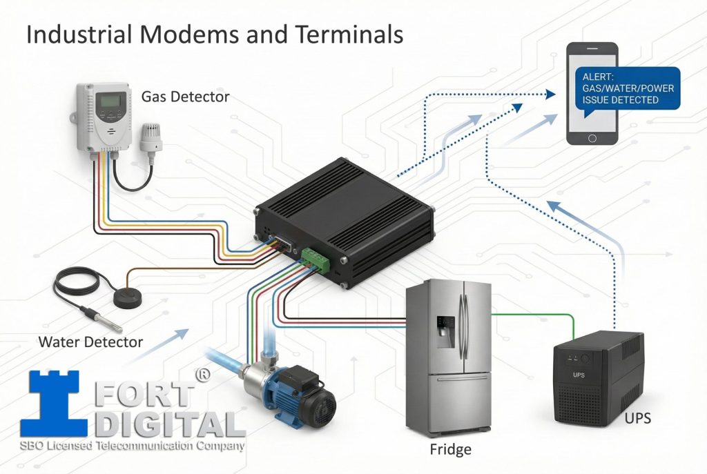 Fort Digital Terminal can be connected to various devices such as gas detectors, water leakage detectors, refrigerators, UPS systems, water pumps, and any other equipment that provides dry contact or 5V–30V relay output. When an event occurs and the contact or relay is triggered, the terminal will immediately detect the signal and automatically send out SMS alerts to the predefined mobile numbers.