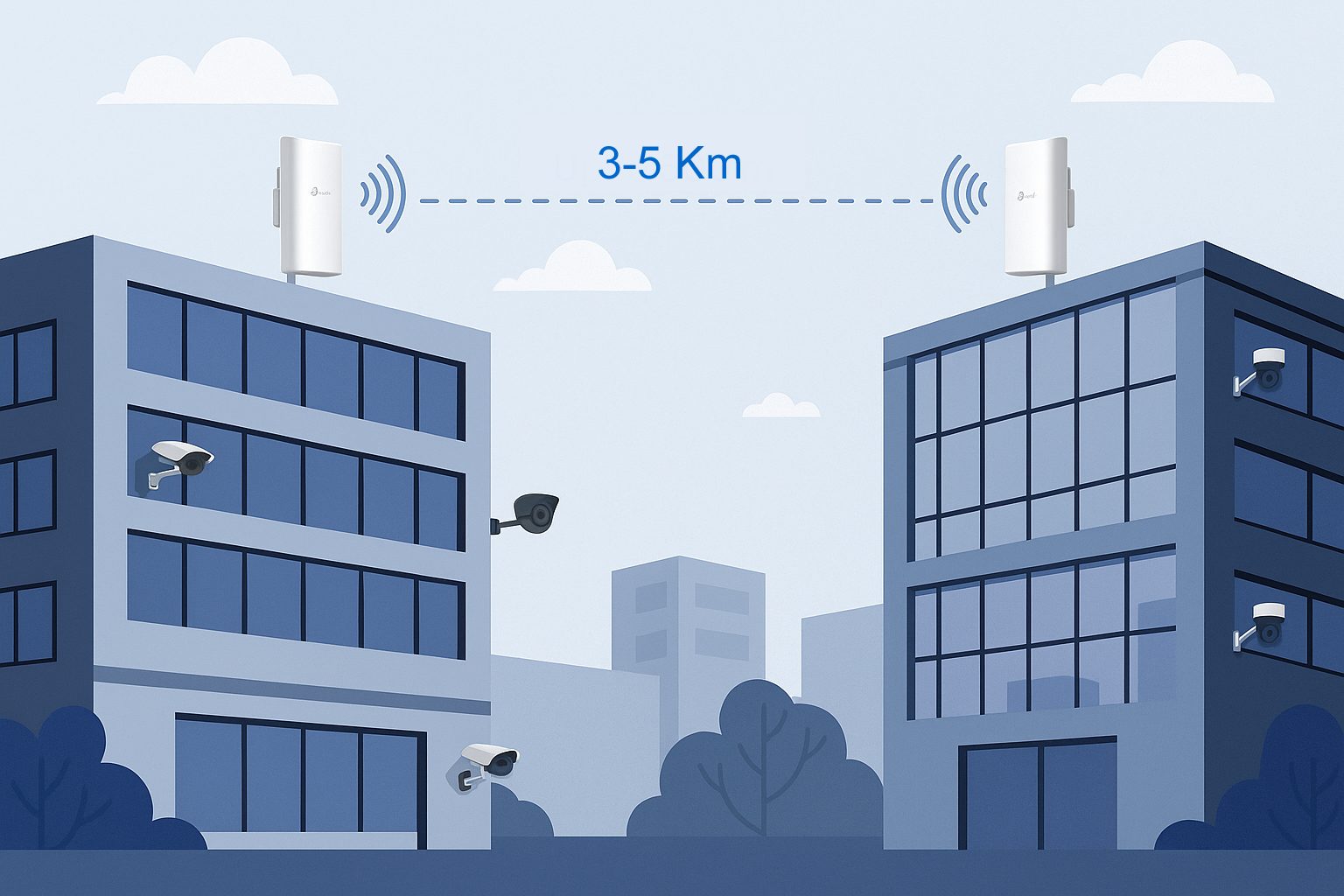 Most CCTV installations are limited by wiring requirements, making it tedious and expensive to run long, elevated cables just to connect cameras. Our solution removes that restriction, allowing you to install CCTV anywhere without laying network cables. Even across two separate buildings as far as 5Km away, where one has no internet, we can deliver connectivity wirelessly from the first building. This means you can place cameras outdoors at any height without the hassle or unsightly look of cabling stretched between buildings.