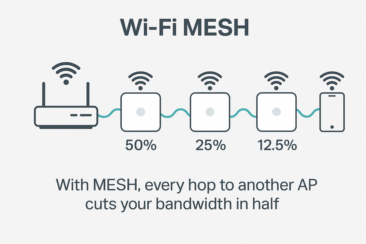 Never setting up your Wi-Fi in MESH mode, it’s only a shortcut, a lazy way, not a professional solution. In a MESH setup, each hop between devices cuts your available bandwidth, so by the time it reaches the last unit, you may be left with just a fraction of the original speed. A properly designed network doesn’t rely on MESH. Speak to us for professional guidance on building a reliable network in any environment without these limitations.