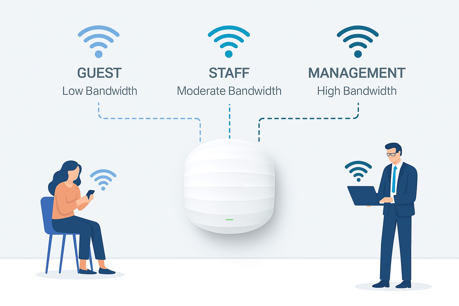 With our configurations, we can create multiple Wi-Fi networks (SSIDs) at the same time. This allows us to create separate networks for different groups of users, such as guests, staff, and management, while applying customized bandwidth limits to each. Guests can have restricted speeds for casual browsing, staff can be assigned moderate bandwidth for daily work, and management can enjoy full-speed connectivity for seamless productivity. This ensures both security and performance optimization across all levels of your organization.