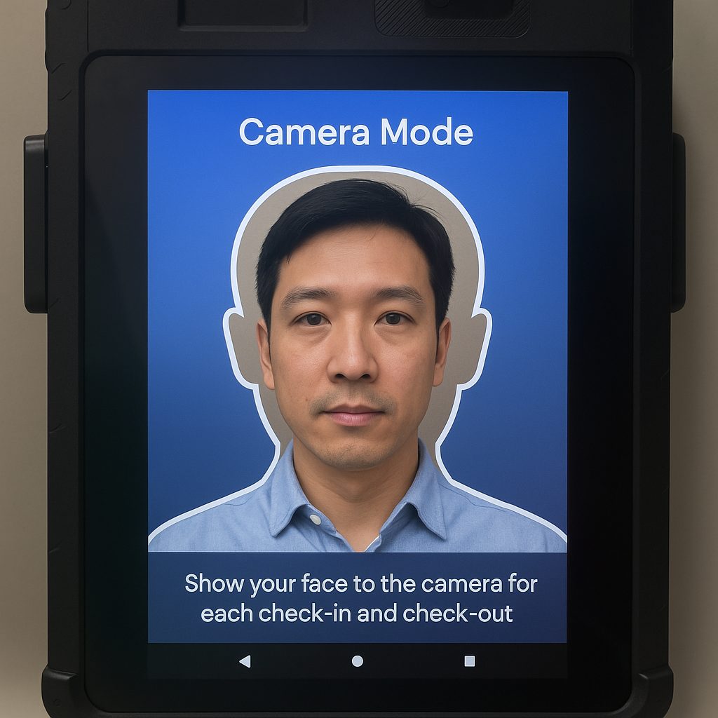 You can enable Camera Mode in the settings. When this mode is active, users must show their face each time they check in or out, allowing the internal camera to capture their image. This feature helps prevent cheating, such as one person checking in for another. With the captured photos, the admin can verify every transaction along with the recorded faces.