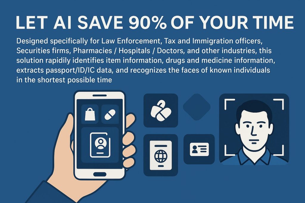 Designed specifically for Law Enforcement, Tax and Immigration officers, Securities firms, Pharmacies / Hospitals / Doctors, and other industries, this solution rapidly identifies item information, drugs and medicine informations, extracts passport/ID/IC data, and recognizes the faces of known individuals in the shortest possible time.